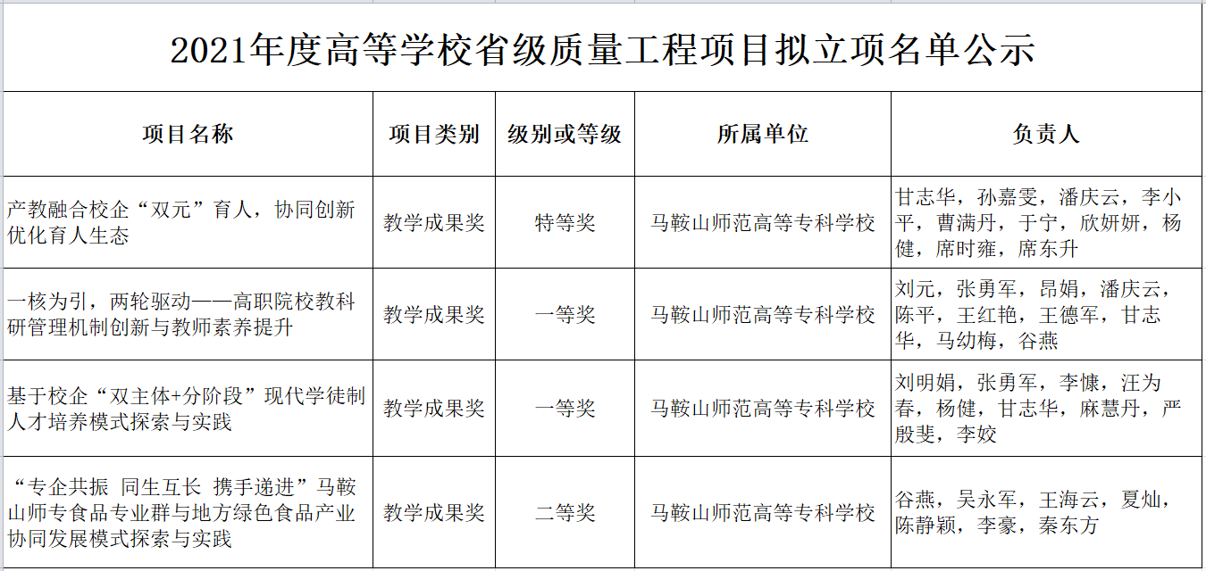 日前,安徽省教育厅公布了2021年度高等学校省级质量工程项目立项名单,马鞍山师范高等专科学校共获批12个大类40个项目。其中教学成果奖类取得新突破,获批省级教学成果奖4项,其中特等奖1项,一等奖2项,二等奖1项。(文/昂娟 编辑/王鑫 黄凌骜 审核/刘元)