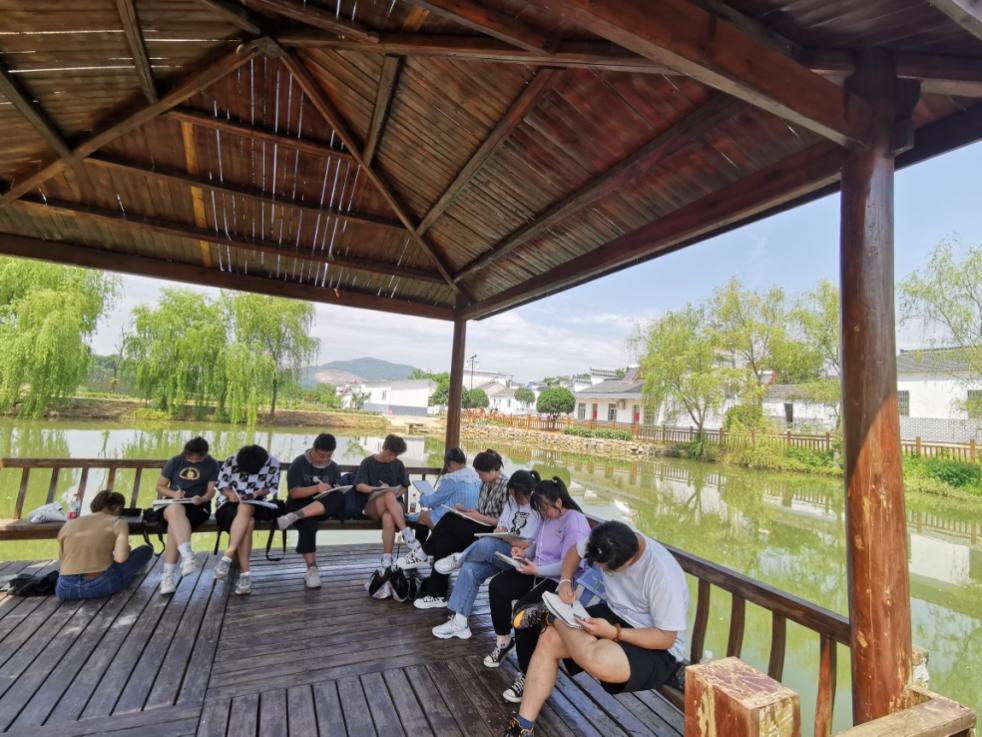 尤其是在写生点之一的和县善厚镇凤台村,老师指导学生们描绘着现代的美丽乡村,半月湖边,风景廊桥……满眼是景,处处入画,学生们在这里画得非常专注投入。凤台村是最早入选省级美丽乡村和安徽省首批乡村旅游创客示范基地的旅游名村,我校作为凤台村乡村振兴帮扶团队牵头单位,此次安排了王店和陈百户村的写生,既让学生们感受到了现代乡村的美丽,为他们的写生提供了丰富的创作素材,也为初步探索多元化助力乡村建设的举措提供了新的视角。