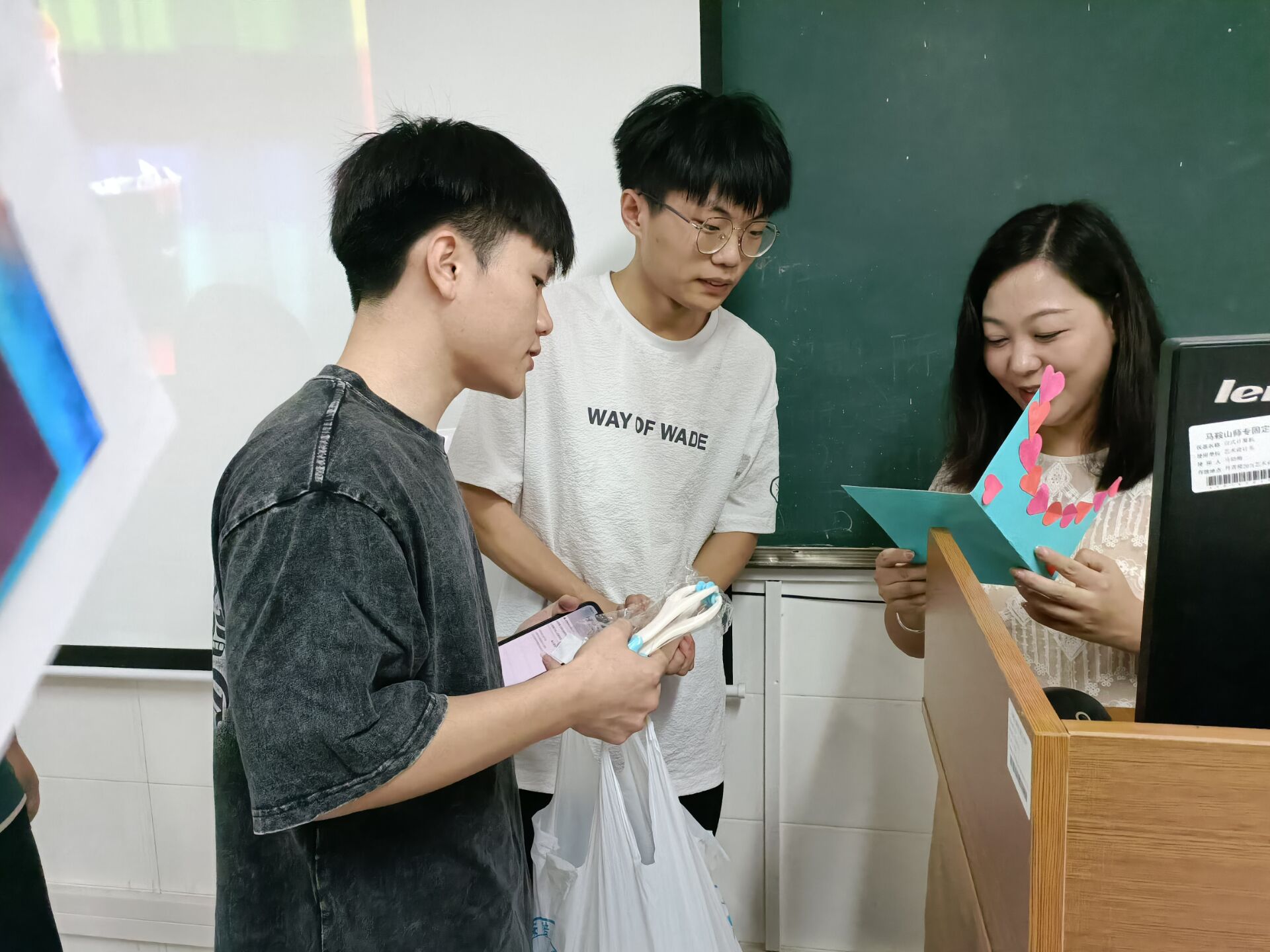 9月9日,学生会成员为每位上课的老师们送上学生自己手工制作的贺卡以及礼品表达对老师们的感谢。在贺卡制作过程中,同学们展现了自己出色的绘画才能,并写下最美的文字,献给敬爱的老师。通过同学们的精心设计和打扮,一张张普普通通的纸变成了充满爱意的教师节贺卡。