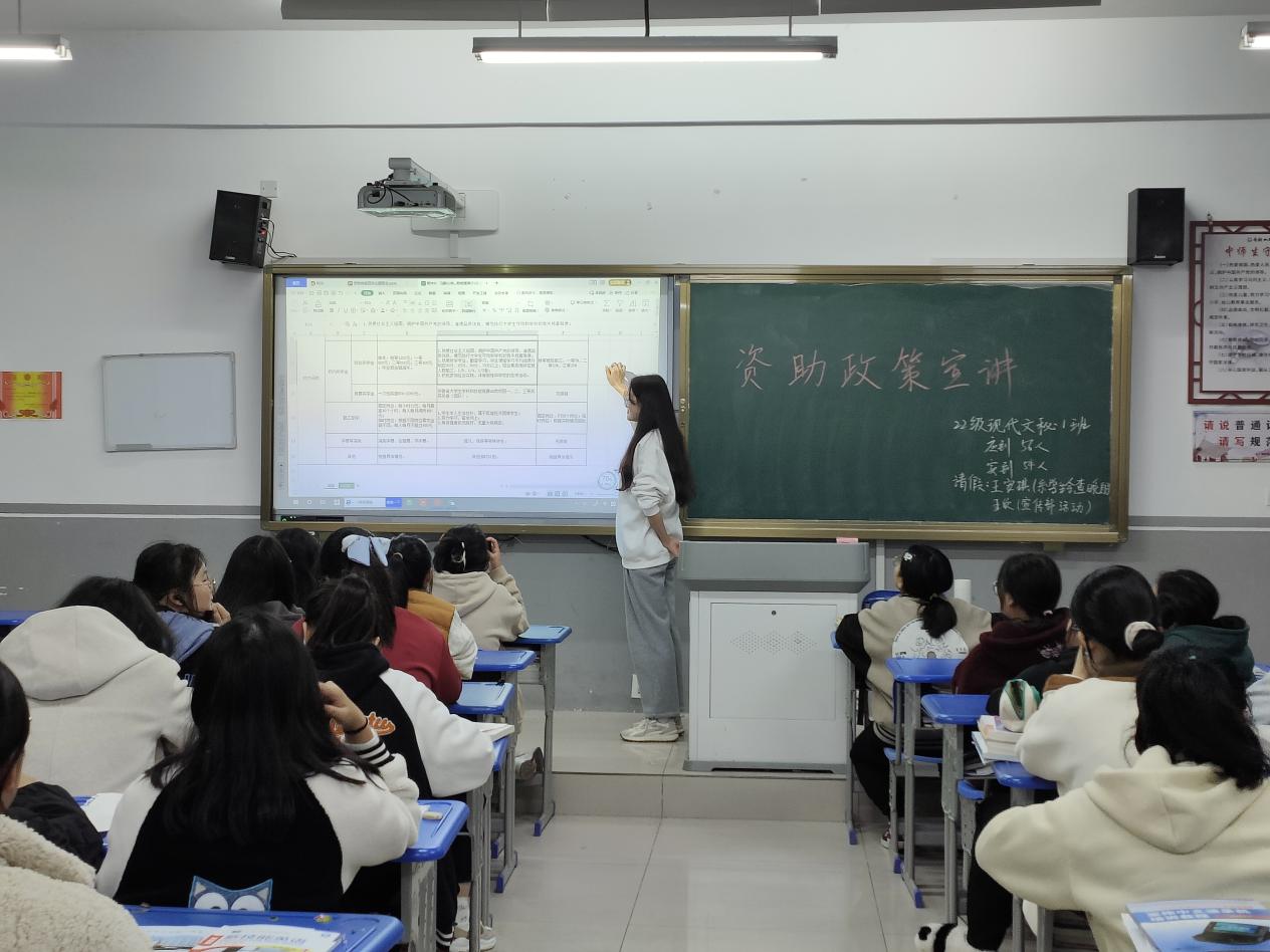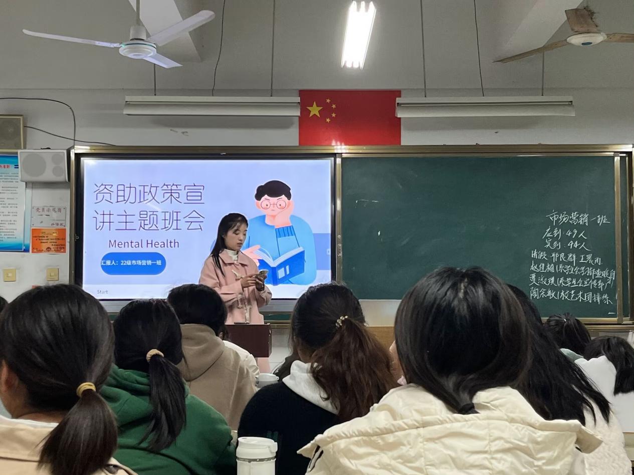 据悉,此次班会主要以PPT的形式为各班同学讲解资助政策相关的政策法规、申请条件、申请流程和注意事项等各方面的事宜。2022级市场营销(1)班班长欧淑怡在讲解完PPT后,耐心地为同学们答疑解惑,帮助同学们能够更清楚地根据自身情况申请资助。