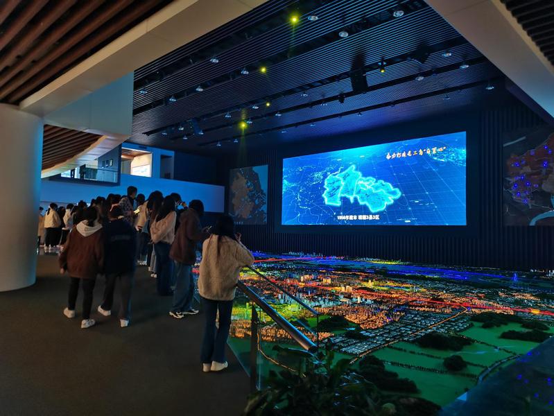 首先,学生们来到了城乡规划馆感受山水诗都——马鞍山的历史变迁。刚走进城乡规划馆,同学们就被展馆中的景象所吸引,跟随着讲解员的脚步一步一步了解马鞍山城市发展的未来蓝图。当来到三楼的主观览台时,同学们纷纷驻足感受着极具视觉冲击力的声光电一体化高科技演示秀。这场视觉盛宴不仅给学生们留下了十分深刻的印象,也让同学们原先对马鞍山模糊的印象逐渐变得清晰,充分了解了马鞍山的市情市貌,增强了学生的归属感。