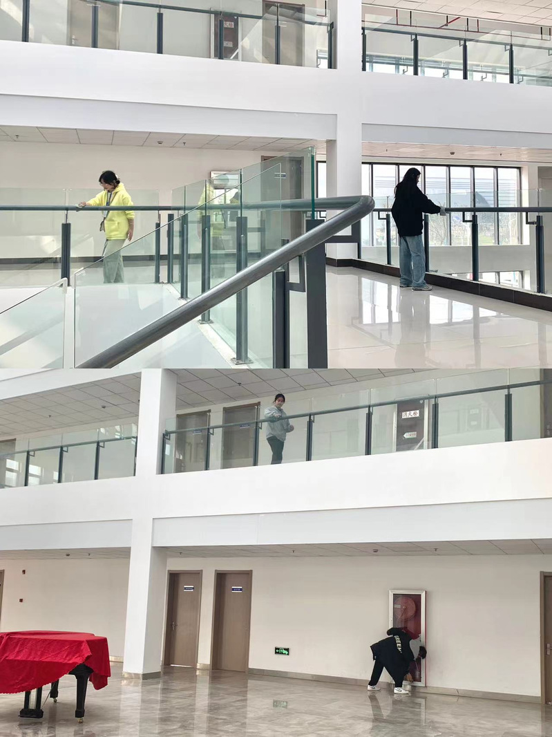 滨江校区3月3日,自律委员会成员和物业人员一起帮学生宿舍打扫电风扇、空调及卫生死角等位置,3月5日校自律委员会成员一起打扫学生公寓楼的楼梯扶手、消防栓污垢、教学楼,行政楼及艺术楼的环境,帮助同学们打造了一个整洁、文明的校园生活环境。