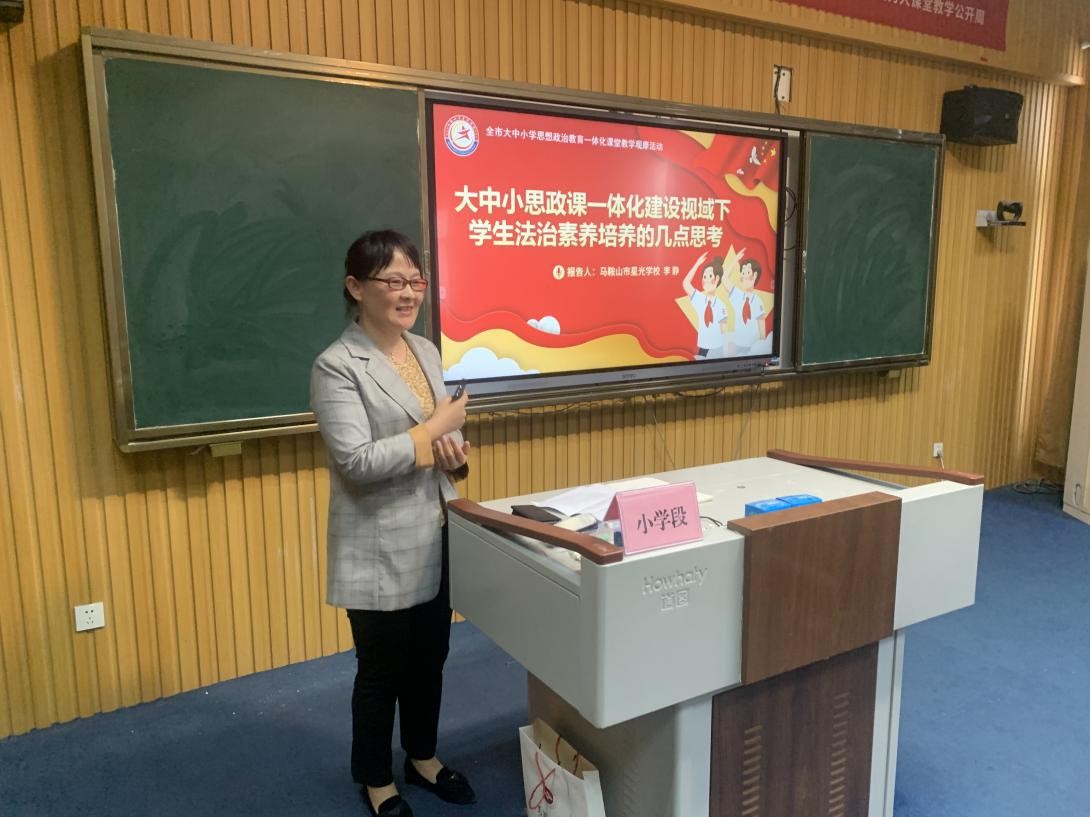 市学科带头人、省大中小学思政课一体化建设主题征文特等奖获得者、星光学校小学思政课师李静和同行分享了法治教育的研究成果。她提出了培养学生法治素养的“三线·四维·五重点”。