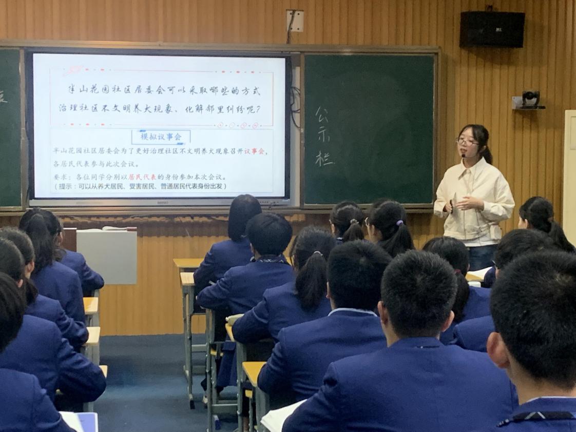 李秋菊老师执教的《基层群众自治制度》一课,以学生身边的社区治理为切入点,让探究半山花园社区的幸福密码。教学中以议题式、小组讨论、模拟议事会等多种形式,让学生在活动中掌握了基层群众自治组织制度的概念、实践方式和意义。李老师选择的小组讨论主题“不文明养犬现象”紧贴社会热点,学生愿意参与讨论并有话可说,激发了学生的参与热情,提升了思政课的有效性与获得感。