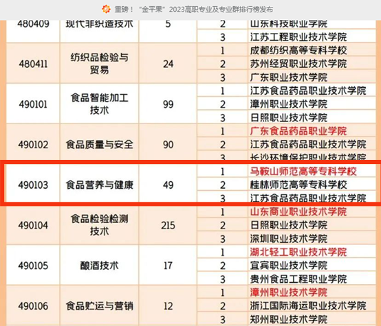 近日,“金平果”发布了第四次高职专业竞争力排行榜,马鞍山师范高等专科学校食品工程系第一批拟升本专业——食品营养与健康,排名全国第一。前三年该专业全国排名分别为第三(2020年)、第二(2021年)、第二(2022年),安徽省排名均为第一。