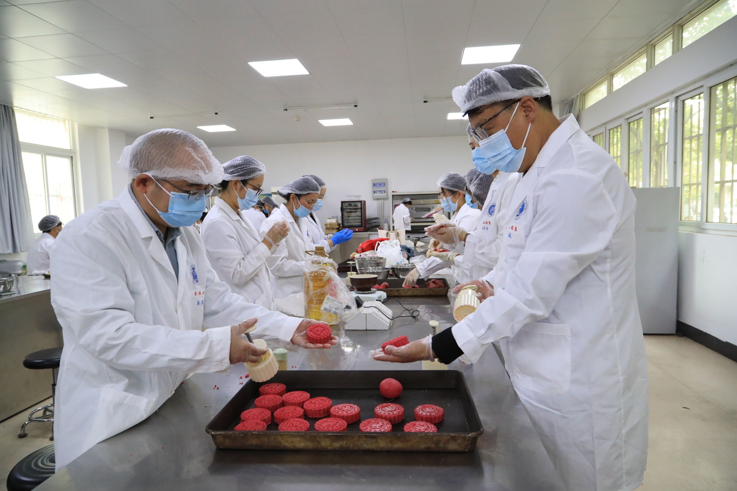 在指导下,师生们分料、揉面、包馅、压模……有条不紊地进行各项制作流程,相互交流制作方法和技巧,现场气氛热烈活跃,一片欢声笑语。经专业烘培,月饼的香味弥漫整个实验室。
