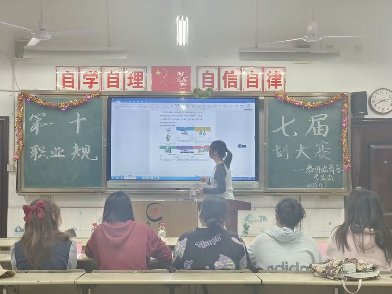 参加比赛的选手不约而同的都选择了成长赛道。第一位作品的是20级小学教育(4)的涂意虹,他的作品:做乡村教育的守护者。从“自我认知,青春筑梦”到“总结感悟,不忘初心”,思路清晰,立意新颖,以成为教师为着眼点,挖掘乡村振兴在教育方面的需求,字里行间都流露出他对乡村教书这一工作岗位的热爱。接下来是22语文教育(1)班的鲍怡平,她从四个方面展开,发现社会存在职业焦虑问题,也表述了自己的职业意愿。职业生涯规划比赛激烈的进行着,选手们结合自己的专业方向、学习技能、理想目标,畅想着自己的未来职业,并为之努力着。