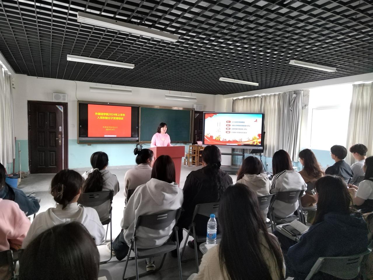 为加强入党积极分子对党的知识的学习,提高入党积极分子的政治素质和理论水平,4月10日下午,外国语学院党总支在精业楼501教室举行入党积极分子党课培训开班典礼和党课培训活动,开班典礼由学院党总支副书记张军主持。