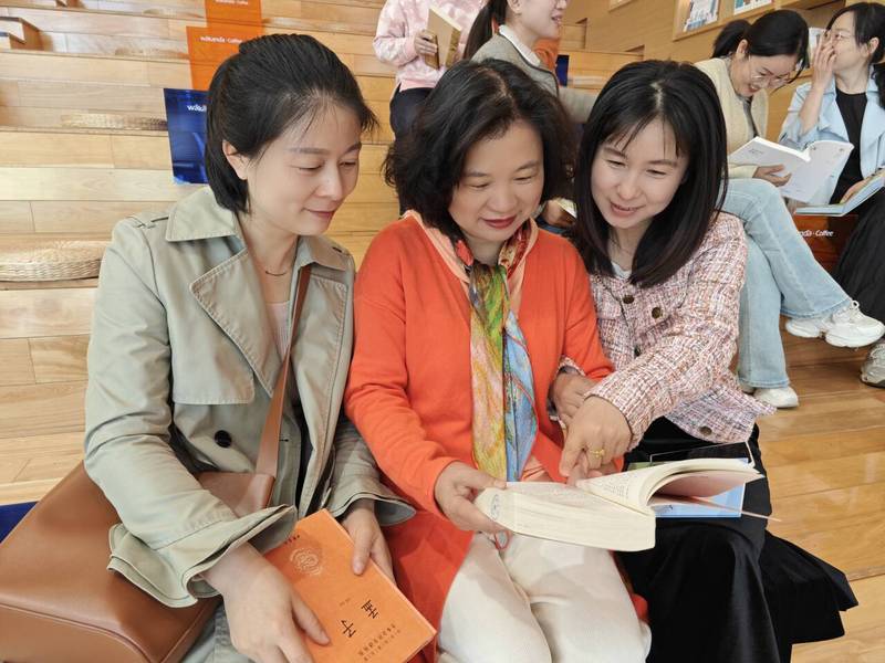 “群山环抱风光秀,碧水一弯上范村”。龙乡上范村一边是风景秀丽的龙山水库,一边是一栋栋高雅别致的民宿。老师们沿着水库边栈道悠闲散步,一路欢声笑语。行至村中商量书房附近,恰逢微雨随风而来,女老师们在浓郁满溢的书香气息中,一边避雨一边享受美好悦读时光。