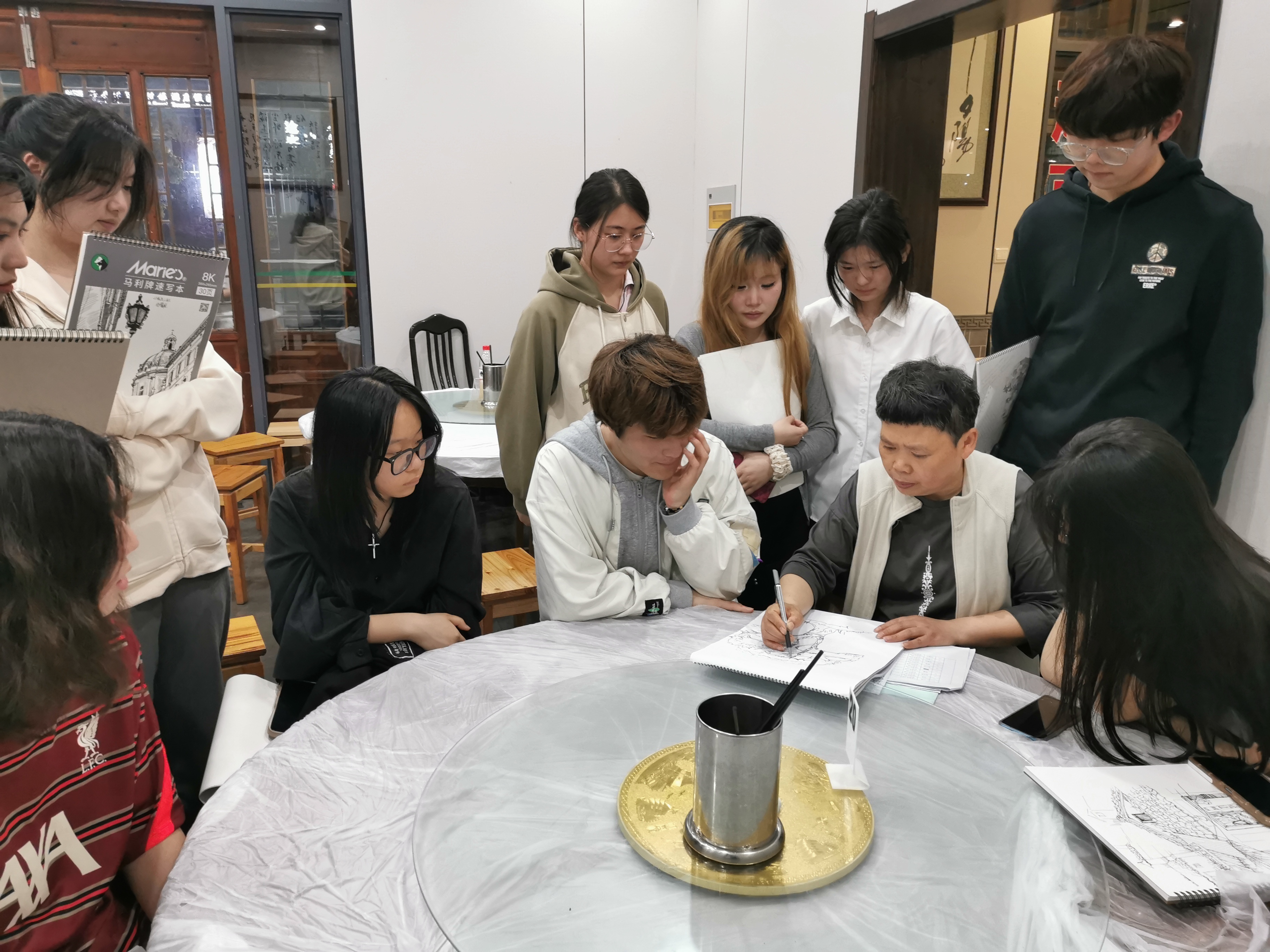 写生教学期间,也不乏特色公开课的开设。4月16日,艺术设计学院院长马幼梅在23服装与服饰设计(2)班在宏村写生基地开设了“写生评画”公开课。针对每位学生白天的写生作品,马幼梅逐一点评、修改示范,整个过程学生听讲认真投入。