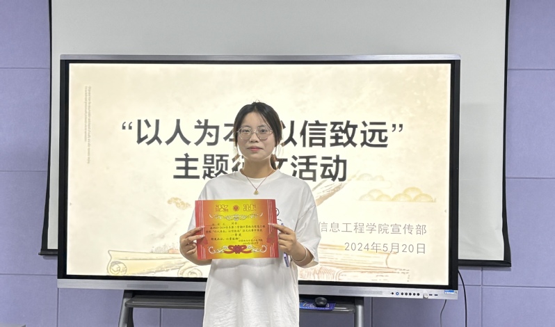 为了提高大学生自身的诚信修养,培养良好的校园风尚,弘扬中华民族优秀的传统美德,5月19日,计算机与信息工程学院举办了“以人为本,以信致远”主题征文活动。