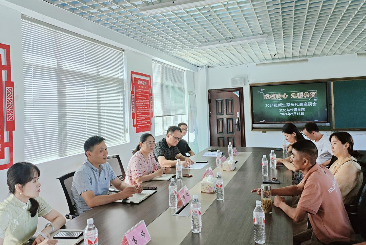 为构筑家校沟通桥梁,凝聚全员育人合力,共同关注和支持学生的成长发展。9月18日,即新生报到当天中午,文化与传媒学院在D401会议室举行2024级新生家长代表座谈会。学院领导班子全部成员以及新生家长代表参加了座谈会。