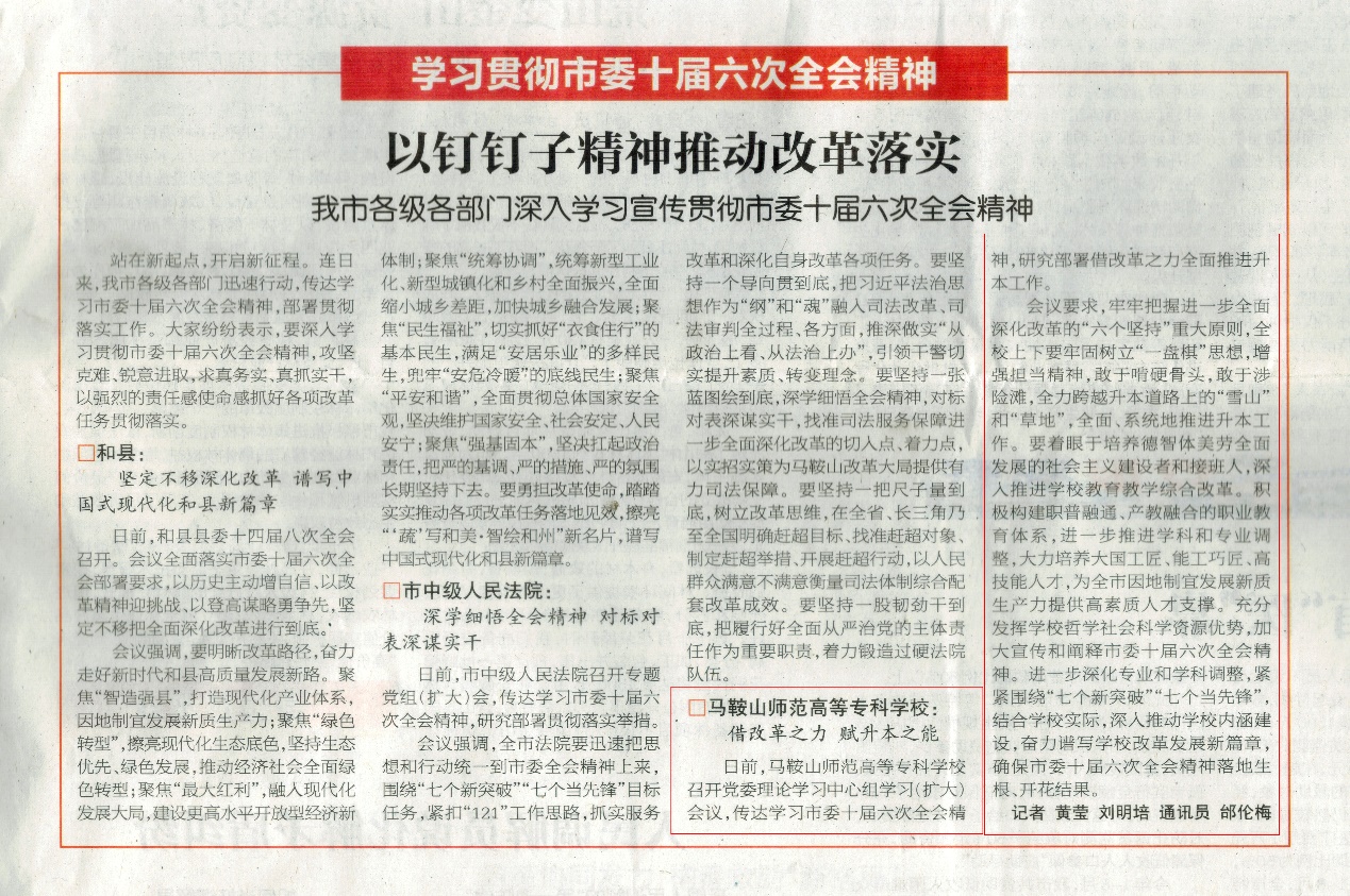 10月10日,《马鞍山日报》头版刊发《以钉钉子精神推动改革落实——我市各级各部门深入学习贯彻市委十届六次全会精神》一文,其中报道了学校落实全会精神相关情况。全文如下: