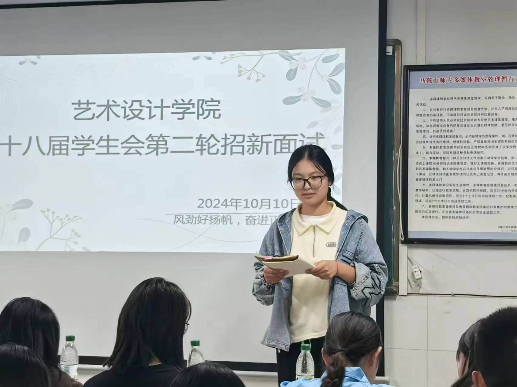 团聚青年,服务引领。为吸纳更多优秀人才、更好促进学生会的发展,艺术设计学院于10月10日晚在丹青楼304教室开展了第十八届学生会招新二轮面试活动,出席本次活动并担任评委的有艺术设计学院党总支书记吴德琴,党总支副书记、组织员、学工办主任王越,团总支书记王昀,团总支副书记邹跃,学生会主席团成员、各部门负责人。