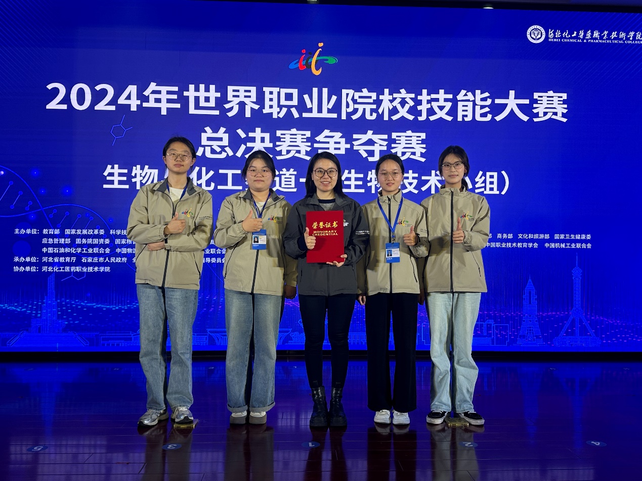 10月20-24日,2024年世界职业院校技能大赛总决赛争夺赛生物与化工赛道——(生物技术小组)比赛在河北化工医药职业技术学院举办,马鞍山师范高等专科学校食品工程学院学生赵加欣、朱雨欣、马丹妮、胡红艳组成的代表队获得三等奖。