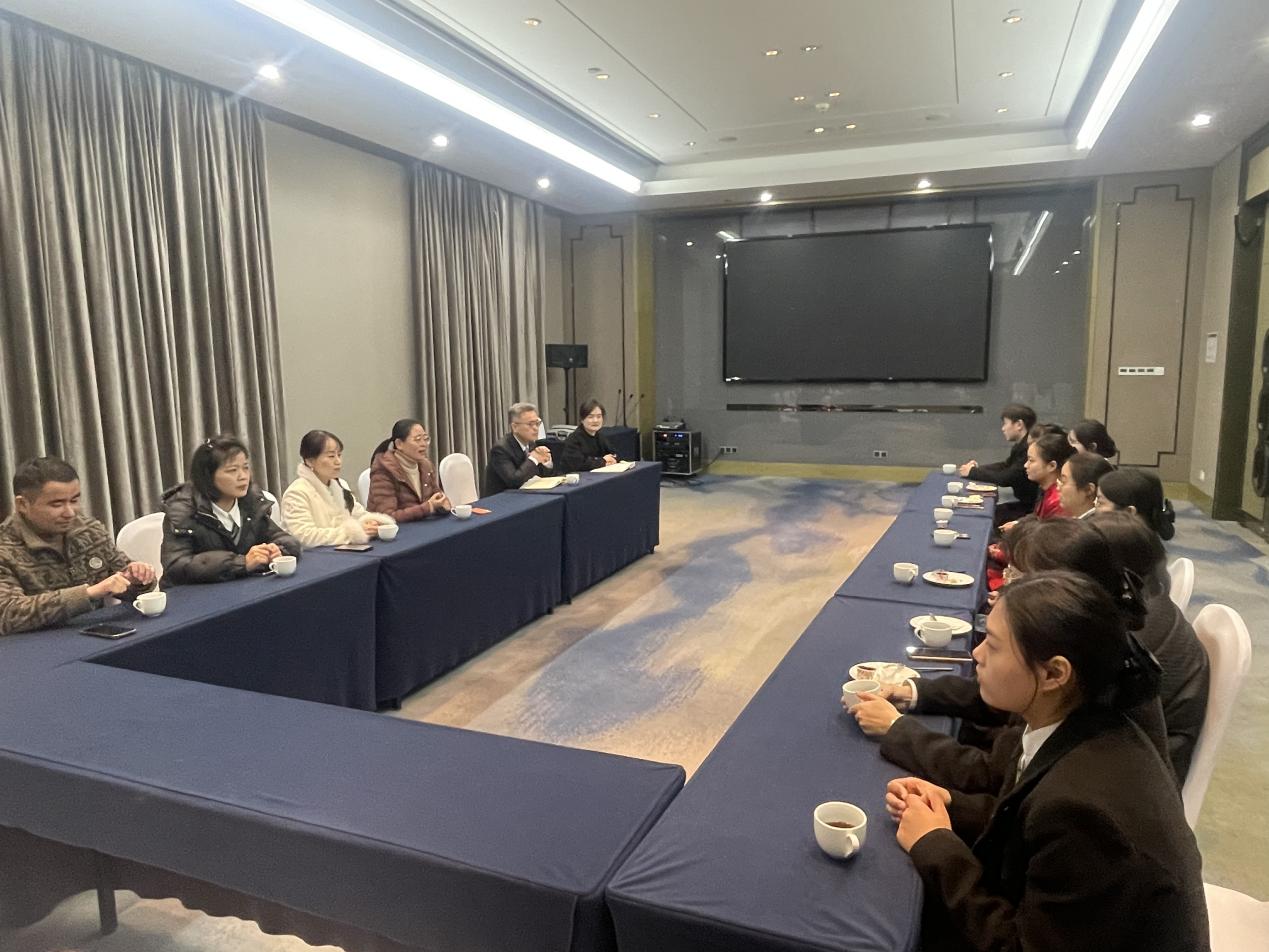 会上,首先刘明娟代表学院领导和老师对学生们表示亲切的问候,并询问同学们实习的具体进度以及有无学习和生活方面的困难,此外,她希望酒店能多关注实习生的需求,让学生既能学有所获又能愉快地完成实习。参会的实习生也一一发表了自己在实习期间的感受以及收获,部分同学也表达了自己的诉求。在听完同学们的诉求后,高婷鼓励同学们要珍惜实习机会,努力提升自己的专业技能,发扬吃苦耐劳的精神,用爱心、耐心和责任心对待工作。毛学强和曹本霞提醒学生在外实习期间要注意人身安全,与同学、同事之间要相互关心照顾。