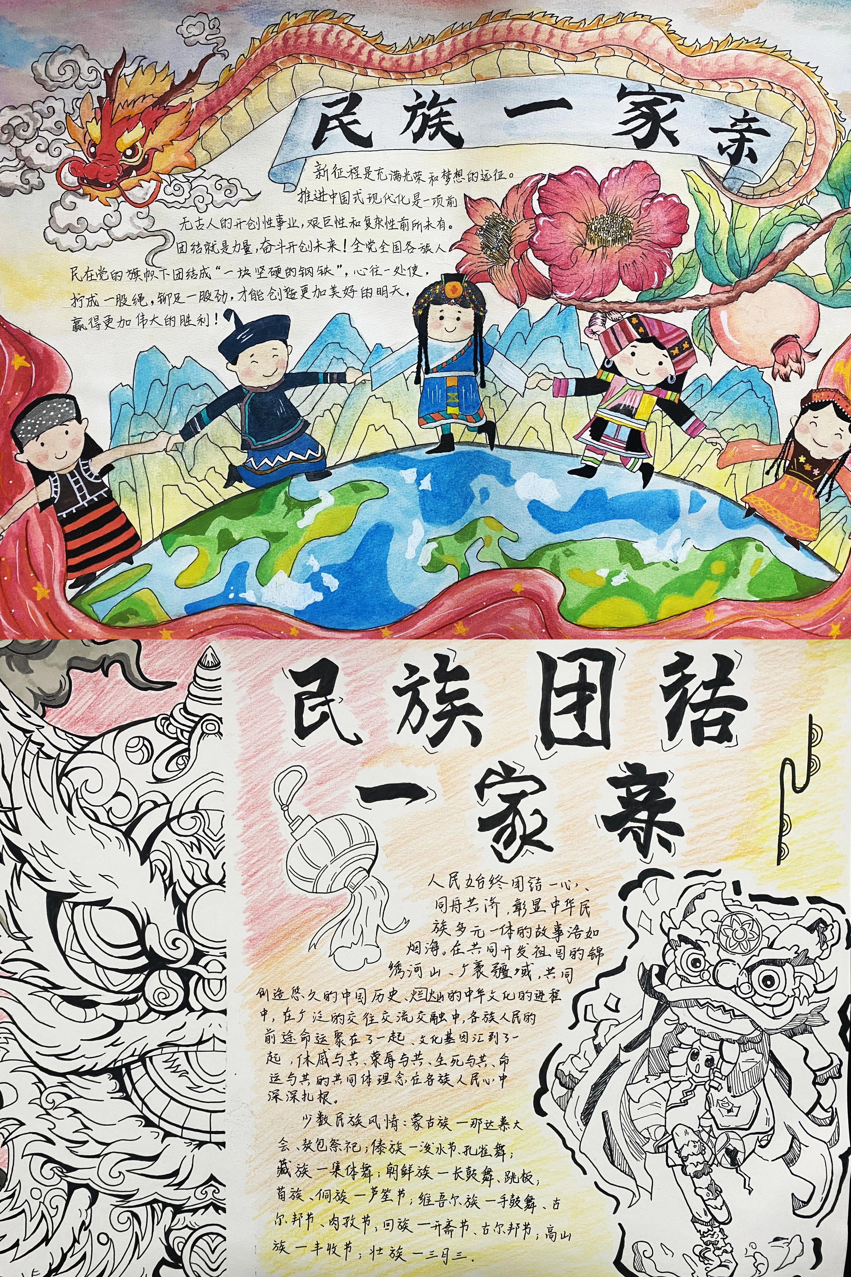 在手抄报比赛中,以“中华民族团结一家亲”为主题,同学们各显身手。他们以画笔为媒介,将傣族孔雀舞、维吾尔族手鼓舞等 56个民族的独特文化元素精心融合,创作出一幅幅绚丽多彩、构思精巧的手抄报作品。这些作品不仅展现了同学们的艺术才华,更深刻诠释了他们对民族团结的理解。