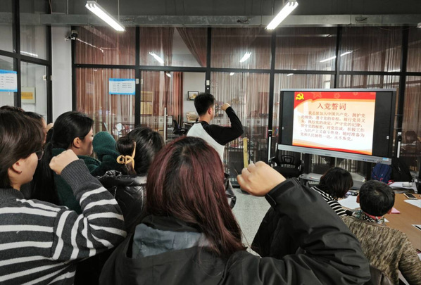 仪式现场,气氛庄重热烈,新入党的学生党员们整齐列队,在领誓人、团总支副书记邹跃的带领下,他们目光坚定,紧握右拳,逐字逐句许下铮铮誓言,每一个音节都饱含着对党的赤诚热爱和为共产主义事业奋斗终身的坚定决心。