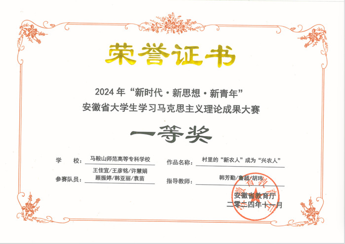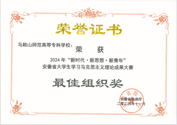 日前,2024年“新时代·新思想·新青年” 安徽省大学生学习马克思主义理论成果大赛隆重举办,共有来自全省73所高校的309项作品入围省赛。经形式审查、作品查重和专家评审,共评出一等奖32个、二等奖61个、三等奖92个。马鞍山师范高等专科学校3项作品入围省赛,荣获一等奖1项、三等奖2项、最佳组织奖1项。韩芳勤、鲁超、胡玮三位老师荣获优秀指导教师奖。