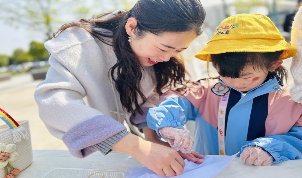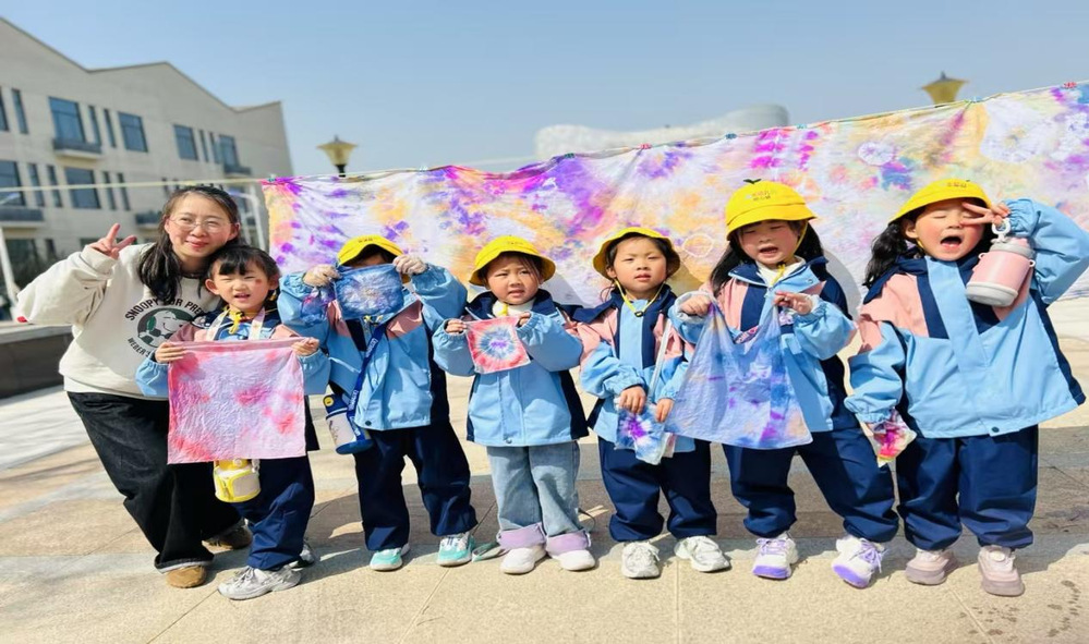 在志愿者们的帮助下,托班和小班的小朋友们用彩色纸板和鲜花做材料,在草地上播种创意,完成了童趣满满的纸板插花;中班和大班的小朋友们走进学前教育学院“非遗工作室”,亲身体验扎染和羽毛画的魅力。学院美术老师程珺君用通俗易懂的语言讲解扎染知识,手把手教幼儿折叠布料、捆扎皮筋、浸染颜料。当一幅幅蓝白相间、花纹独特的方巾在春风中展开时,孩子们欢呼雀跃:“我的布上有星星!”“看,我染出了一朵花!”