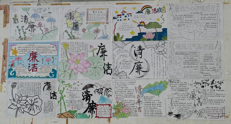 活动一开展,就得到了同学们的广泛关注和热情参与,征集到许多精心创作的手抄报作品。同学们紧扣廉洁主题,充分发挥想象力和创造力,用多彩的画笔诠释心中的廉洁理念。有的作品生动再现了“两袖清风”等历史典故,有的通过创意漫画讲述廉洁小故事,还有的巧妙融入现代设计元素,展现新时代的廉洁风尚。每一幅作品都饱含深意,既展现了同学们的艺术才华,更体现了大家对廉洁文化的深刻思考。