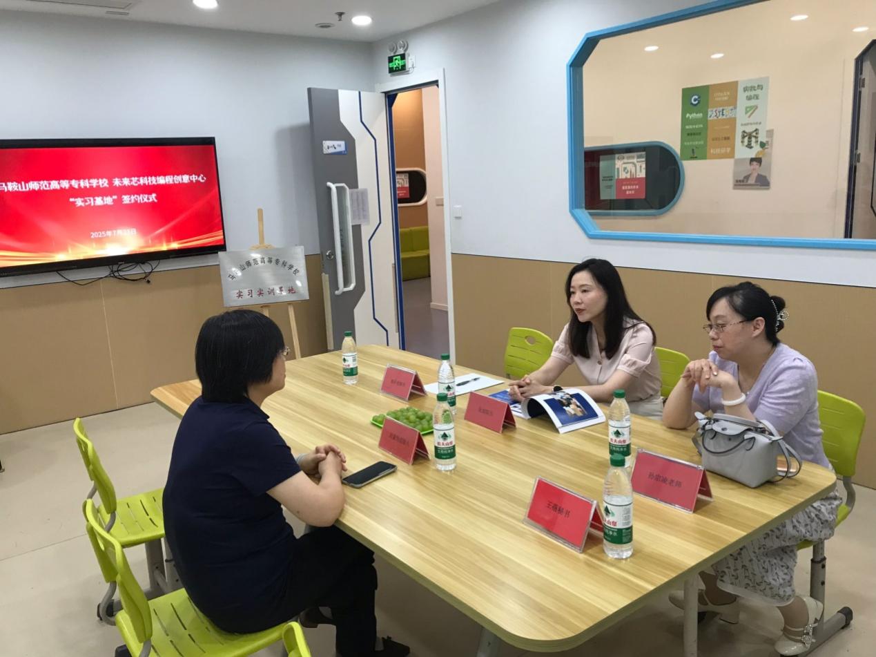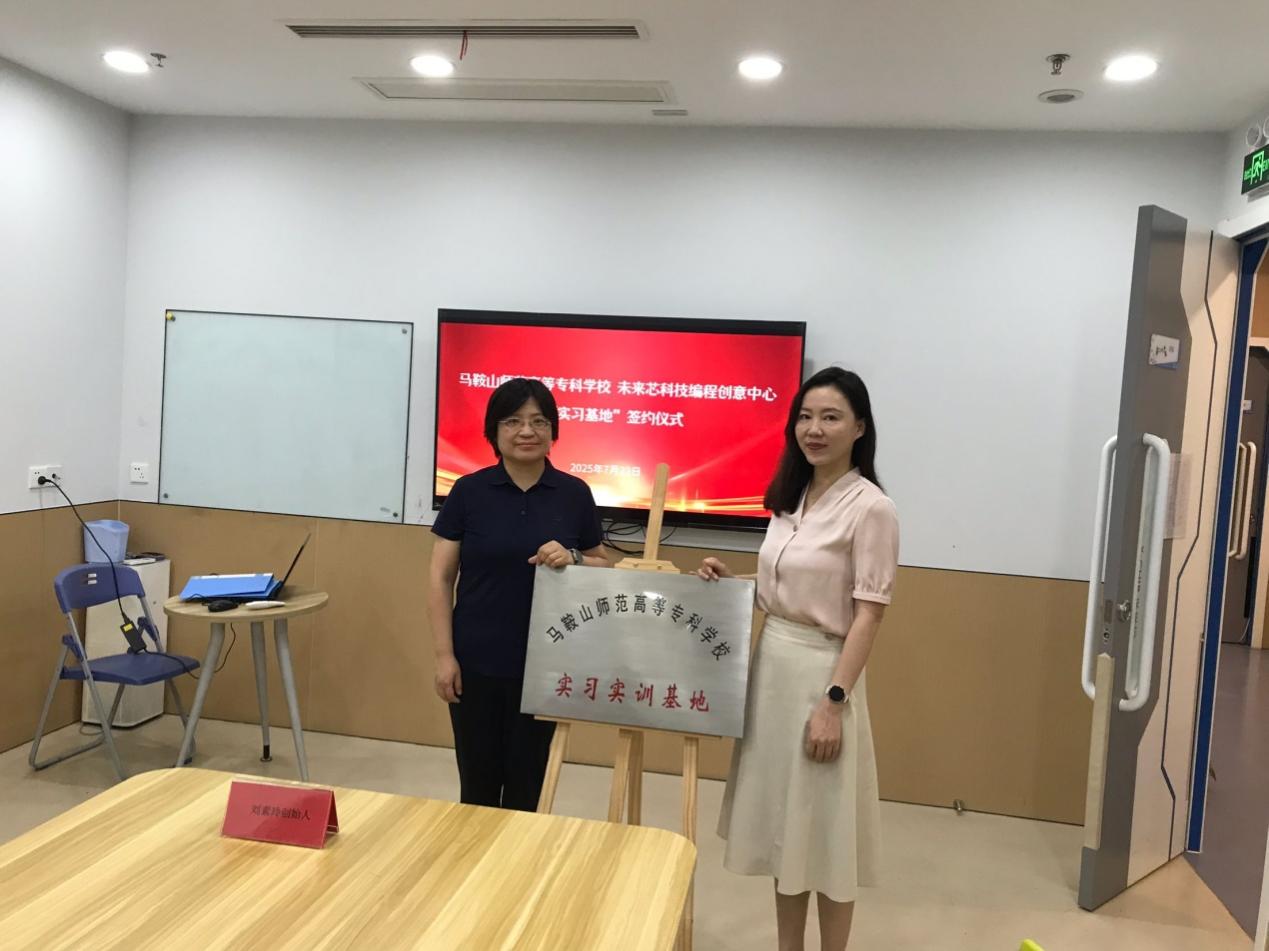 座谈会上,阮娟介绍了教师教育学院的专业设置、人才培养特色及近年来在教育实践基地建设方面的成果。她表示,深蓝教育在科技教育领域的实践经验与学院的人才培养目标高度契合,希望以此次合作为契机,推动双方在学生实习实训、课程资源开发、科研项目合等方面的深度合作,实现优势互补。随后双方正式签订《教育实践暨科研基地协议书》,并共同为“马鞍山师范高等专科学校实习实训基地”揭牌。