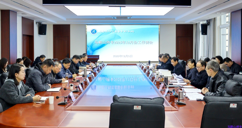 12月5日,马鞍山师范高等专科学校召开2025年12月份工作例会。党委书记李怀东主持会议并讲话,党委副书记、校长刘淑凤出席会议并讲话,校领导杜维斌、夏慧新、李胜、栗亮、全立荣、潘可国参加会议。会议全面总结11月份工作成效,系统部署12月份重点工作任务。