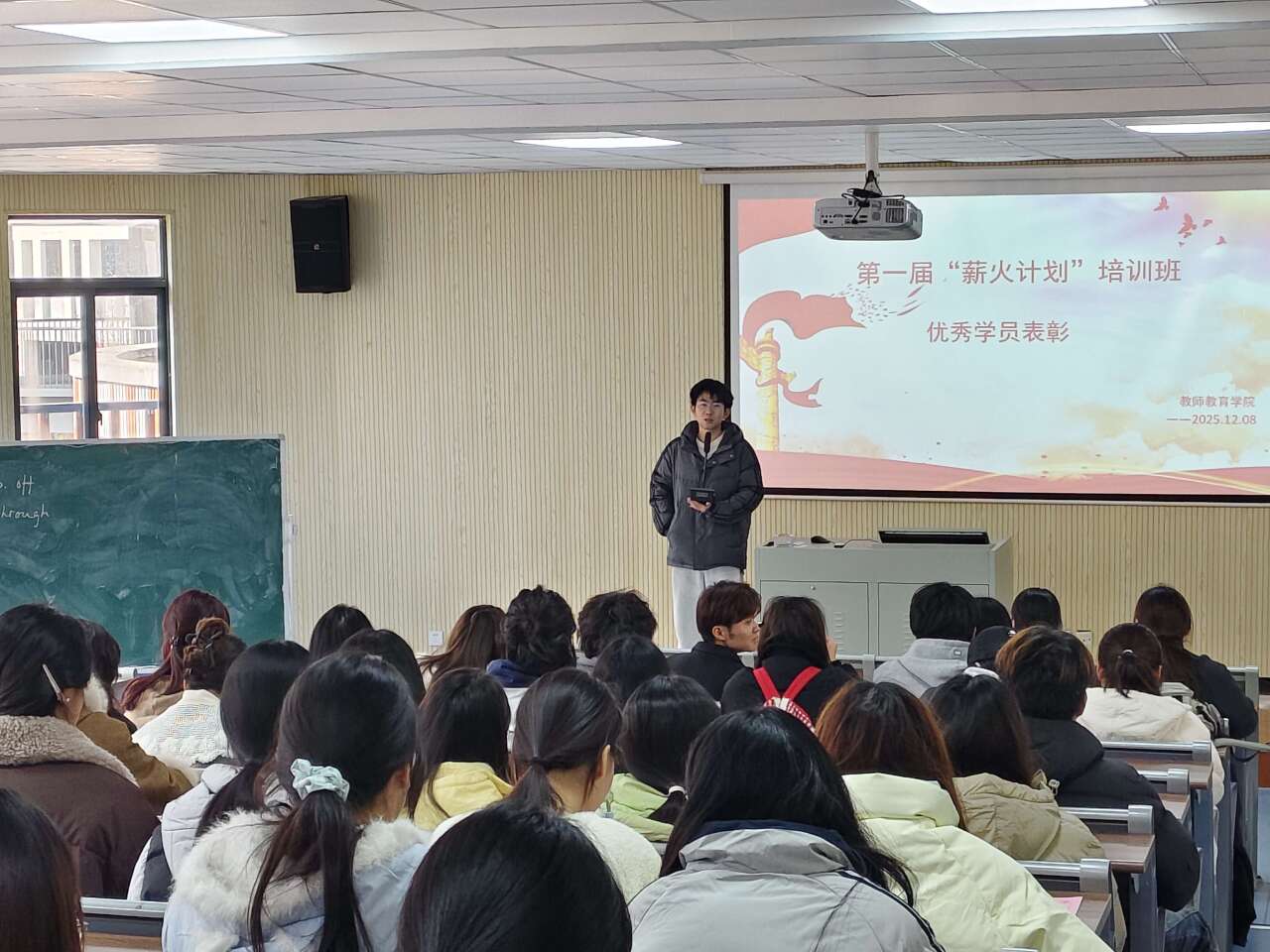 紧接着,对学院首届“薪火计划”培训班优秀学员进行颁奖。“薪火计划”旨在培养青年的综合素质和创新能力,为他们的成长搭建平台。经过严格的评选,一批表现出色的学员脱颖而出,获得了表彰。团总支副书记汪文君对优秀学员颁奖,并做总结发言,他强调班委需主动掌握班级信息,加强与辅导员的沟通,班委间应通力协作,学长学姐也应发挥好“传帮带”的作用。作为学生干部,需牢记学业是核心,不可重管理轻学习,希望受表彰的优秀学员珍惜荣誉、再接再厉,传承薪火精神,在学习与实践中持续成长。