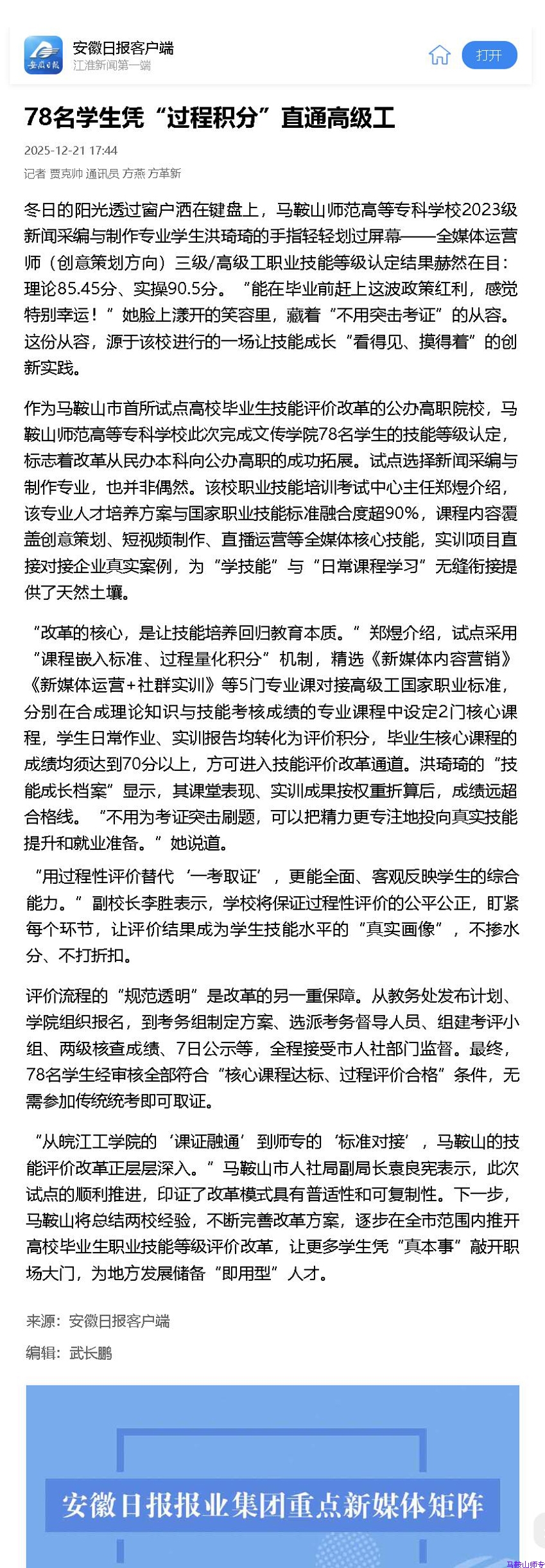 冬日的阳光透过窗户洒在键盘上,马鞍山师范高等专科学校2023级新闻采编与制作专业学生洪琦琦的手指轻轻划过屏幕——全媒体运营师(创意策划方向)三级/高级工职业技能等级认定结果赫然在目:理论85.45分、实操90.5分。“能在毕业前赶上这波政策红利,感觉特别幸运!”她脸上漾开的笑容里,藏着“不用突击考证”的从容。这份从容,源于该校进行的一场让技能成长“看得见、摸得着”的创新实践。