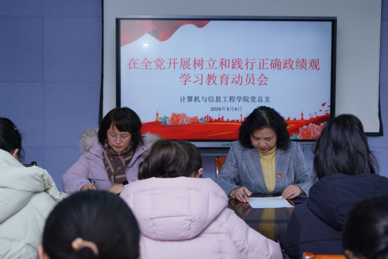 3月4日下午,计算机与信息工程学院在行知楼601会议室开展树立和践行正确政绩观学习教育动员会暨教职工政治理论学习会。会议由学院党总支书记王莉娟主持并作动员讲话,学院全体教师参加会议。